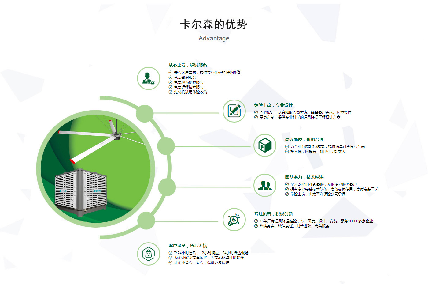 ??晉江市卡爾森機電設備有限公司是一家集設計、制作、銷售、安裝工業通風設備、中央空調、節能環??照{、脈沖除塵設備、環境凈化工程、等環保工程企業。并提供環境影響評價、環保工程總承包、環保工程設計、環保工程運營、環保工程成套設備等一站式服務。公司一直誠心服務于工業廠房的通風設施,我們的產品:“品種齊全、質量優越”。根據客戶的需求精心設計,高質量的制造,力求使每個產品都達到合理耐用、節能環保??茖W的設計和精美高品質的產品,完善的服務系統,加強售前、售中、售后服務,對顧客在使用商品中出現的各種問題及時解決,使顧客無后顧之憂。產品廣泛適用于各類型制造業、機械類、五金冶煉、食品、化工、電子、紡織、噴涂、娛樂以及服務等場所。我們秉承“質理過關、價格合理、交期準時、服務周到”而受到新老客戶的好評和信賴。我們堅持“客戶至上、質量上乘”為宗旨,努力工作,為您換來潔凈美好的明天??柹敢赃^硬的質量,良好的信譽同各界朋友一起開創更加輝煌的未來。
